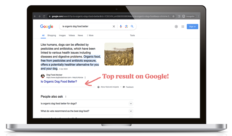 Impact: Through dedicated and consistent content, The Dog Food Adivsor now ranks on the first page of google for many popular search topics (see below examples).