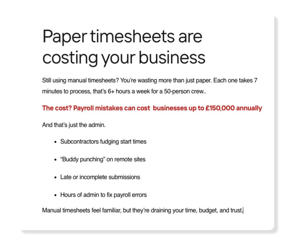 TimeKeeper wanted clear writing to speak directly to the construction and field industry. We wanted to ensure the benefits were apparent and stand out among competitors. We used keywords and strategic writing to ensure TimeKeeper is easily found.